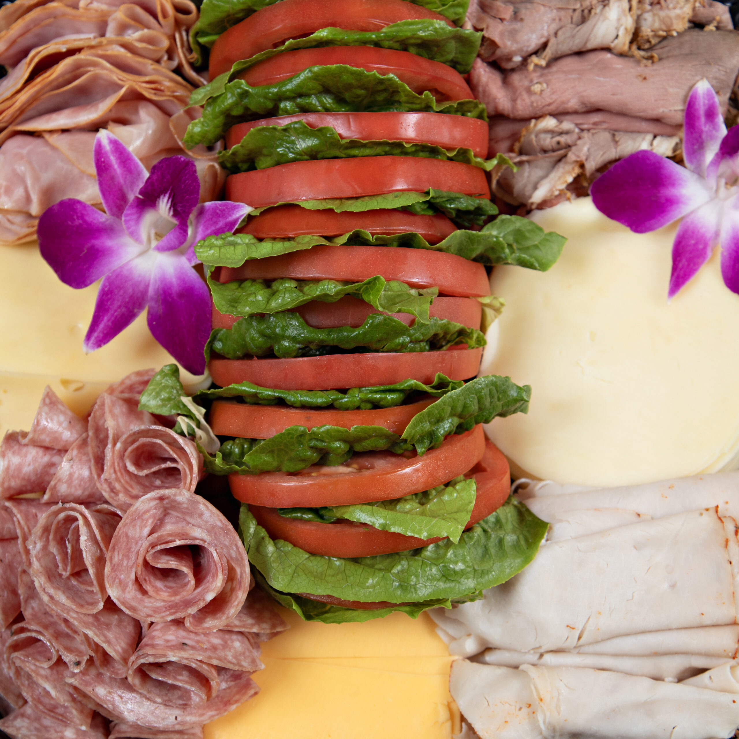 Our own roast beef, salami, ham, turkey, Swiss, American and provolone cheeses, served with lettuce, sliced tomatoes, mayo, mustard, with assortment of breads.